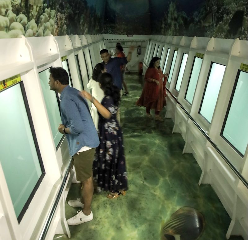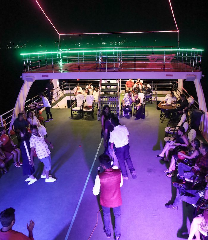 On your arrival, you will be provided with welcome drinks. Once the boarding process is completed, we will set sail and live music will start to entertain the guests onboard. The live music will take place at the open deck area where you can enjoy the panoramic view of the islands along with the music. You can as well order drinks at the Bar that is available onboard. The cruise has 3 decks - The open deck dedicated to dance, music and to enjoy the view of the islands. The middle deck has seating for a lovely dining experience and the lower deck has a glass-bottom area where you can go to explore the sea life at night. If you are lucky you can see some fishes.